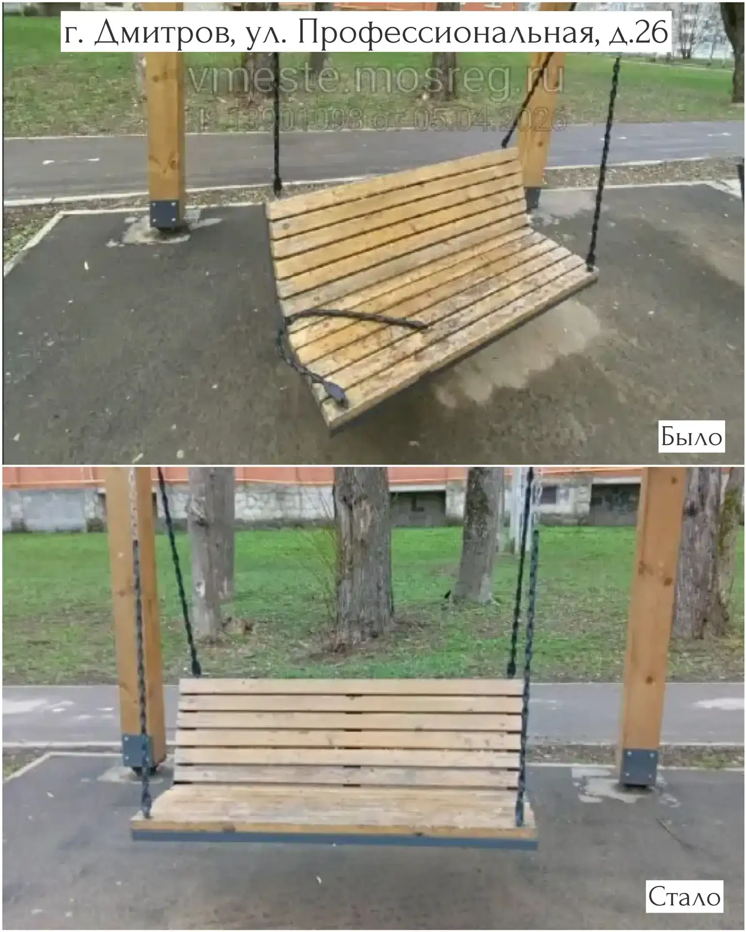 г. Дмитров, ул. Профессиональная, д. 26 — произведён ремонт качелей.