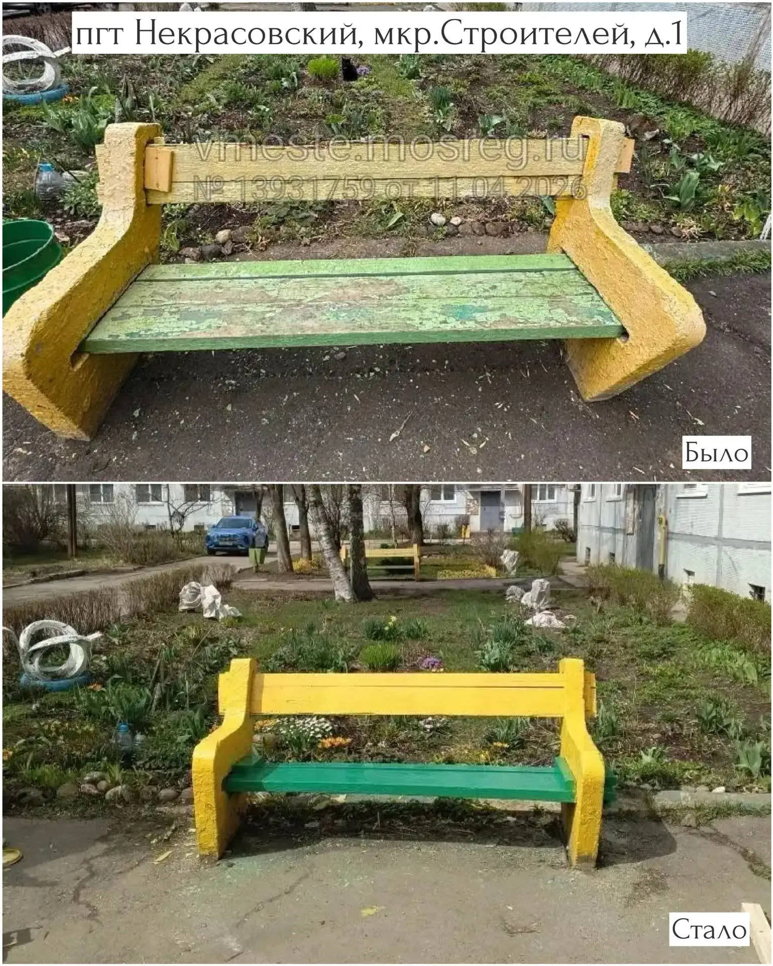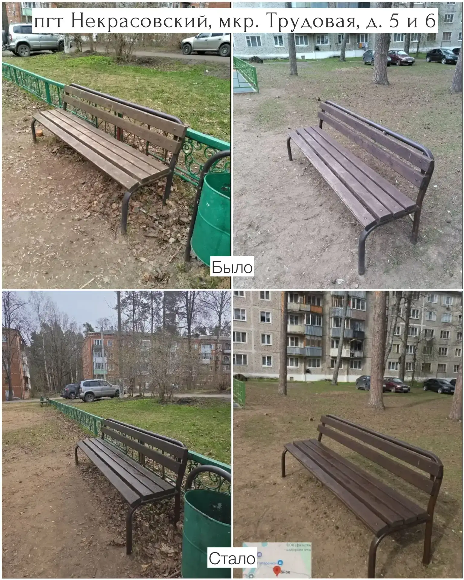 пгт Некрасовский (мкр. Строителей, д. 1; мкр. Трудовая, д. 5 и 6) — осуществлены подготовительные работы (шлифовка поверхностей) и последующая покраска лавочек.