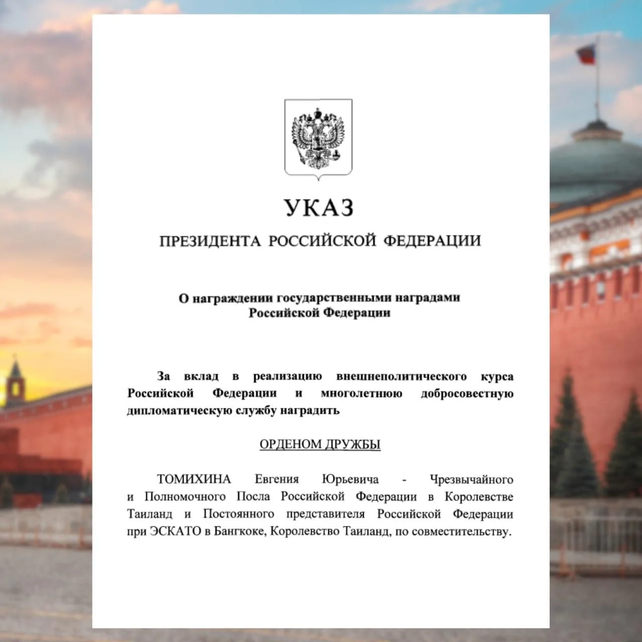 Чрезвычайного и Полномочного Посла Российской Федерации в Королевстве Таиланд и Постоянного представителя Российской Федерации при ЭСКАТО в Бангкоке, Королевство Таиланд, по совместительству – ТОМИХИНА Евгения Юрьевича