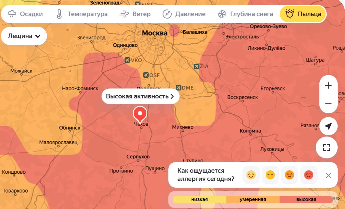 Аллергики, внимание: в Чехове началось цветение берёзы — уровень пыльцы уже довольно высок. Кроме того, продолжается пыление лещины и ольхи.