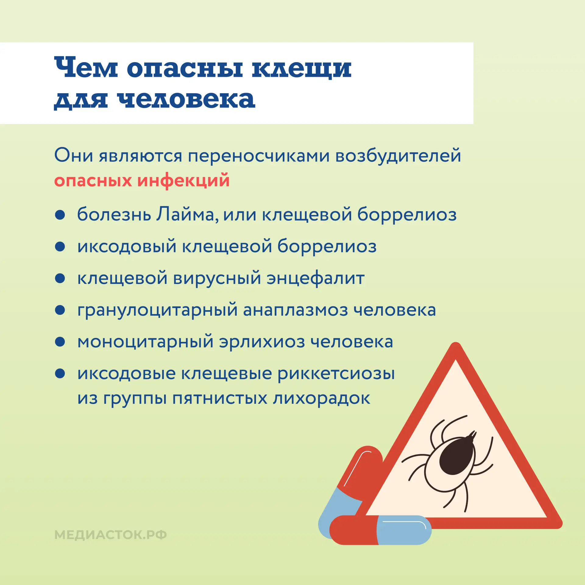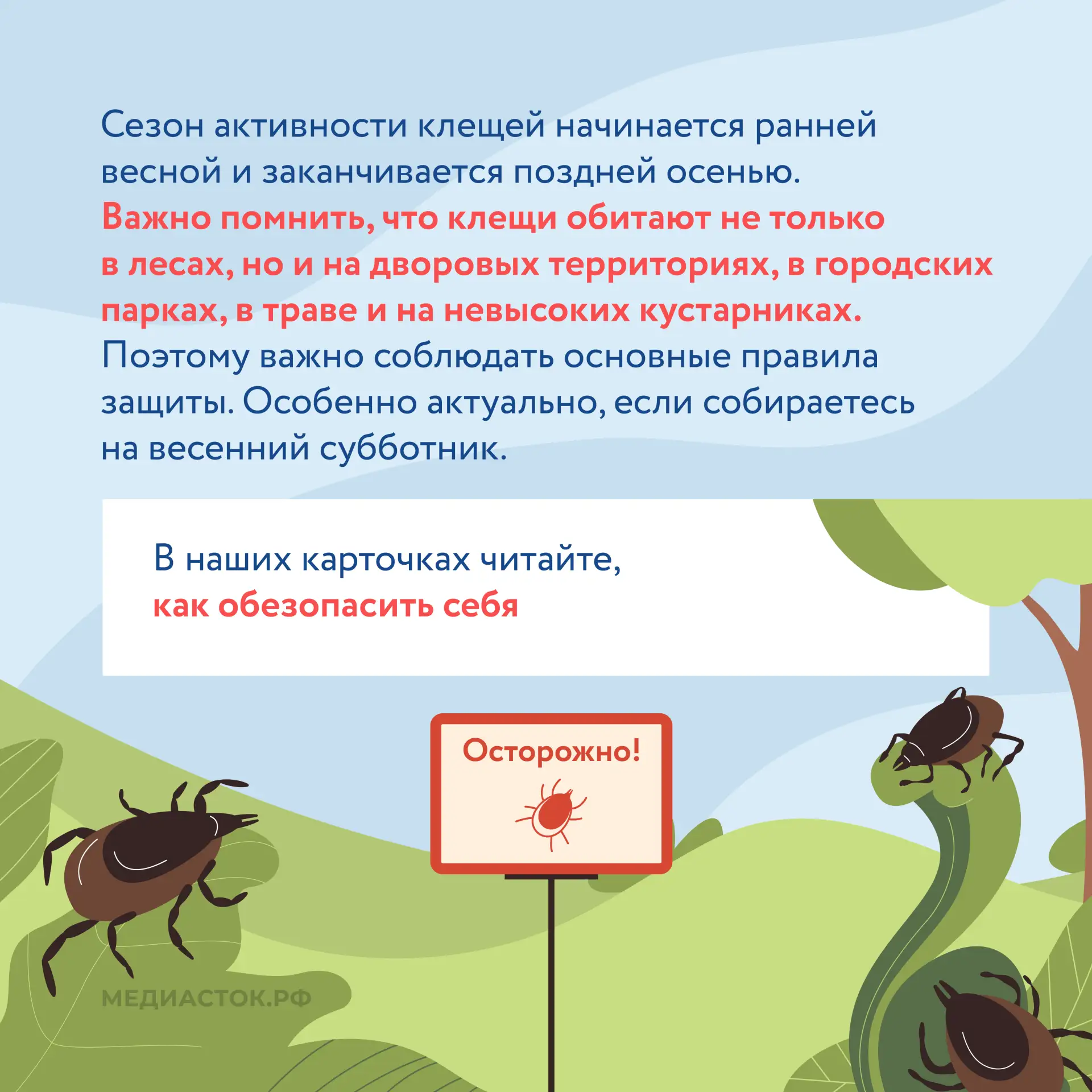 Начался сезон активности клещей. Важно помнить, что членистоногие обитают не только в лесах, но могут встретиться и в городских парках, во дворах, в траве и на невысоких кустарниках.