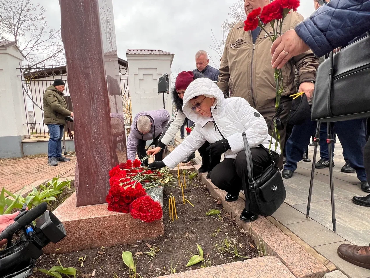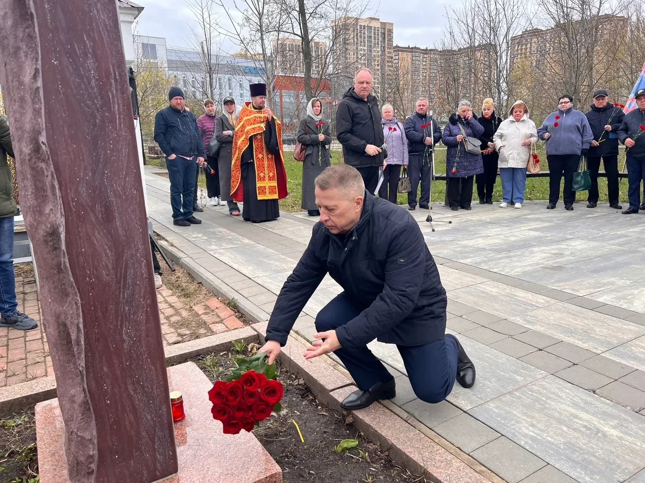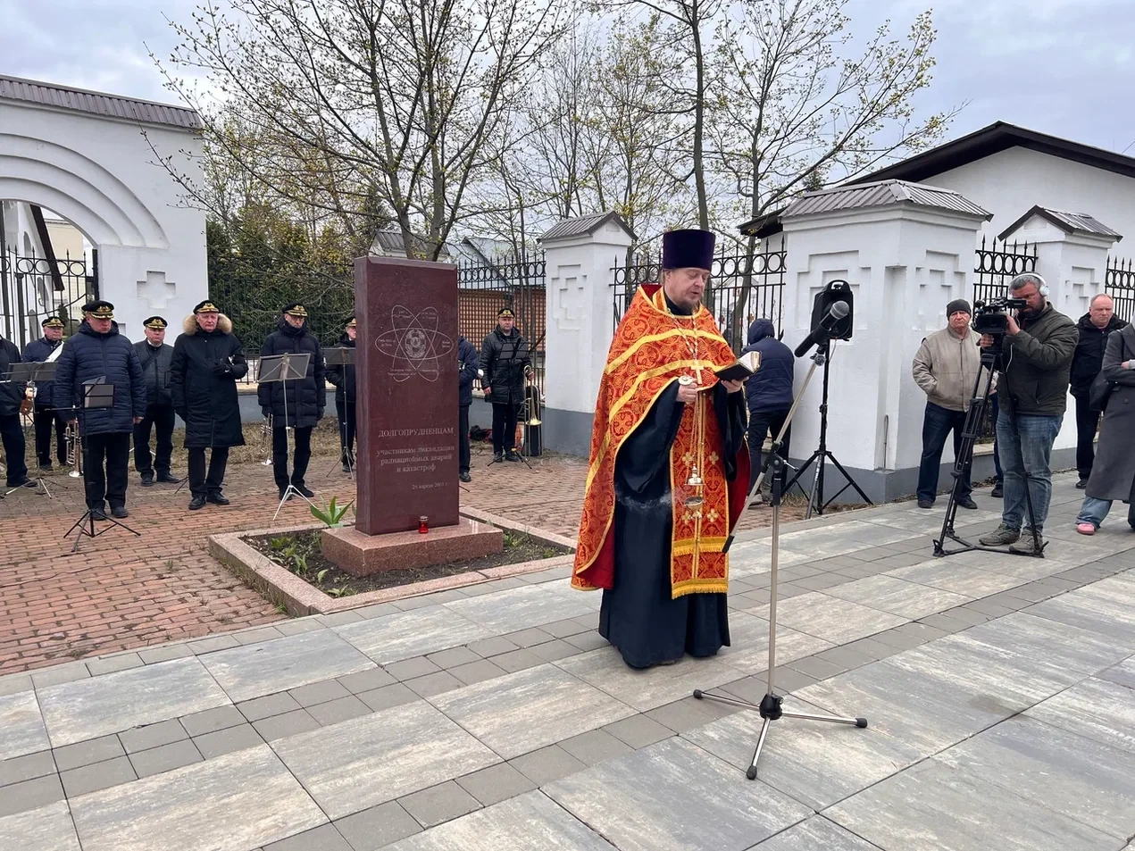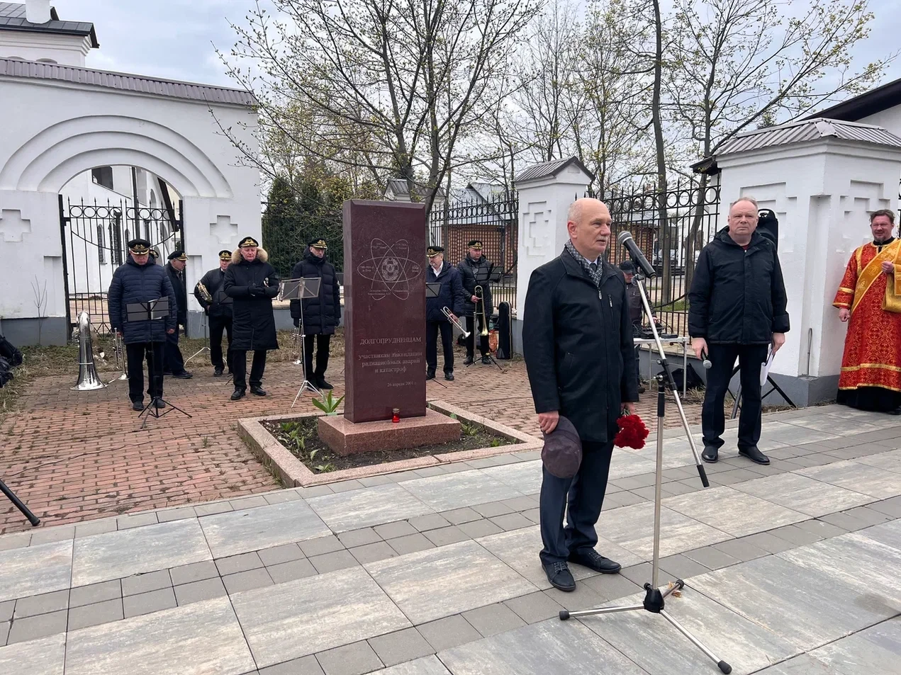 Клирик Преображенского храма Вячеслав Осипов отслужил панихиду по ушедшим ликвидаторам, собравшиеся возложили цветы к памятной стеле.