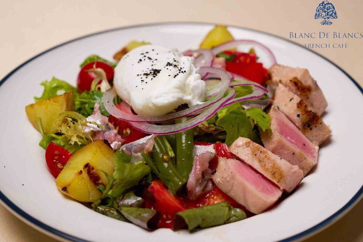 - Тунец на гриле (medium-rare) + солёные анчоусы + яйцо пашот — для яркости и насыщенности;