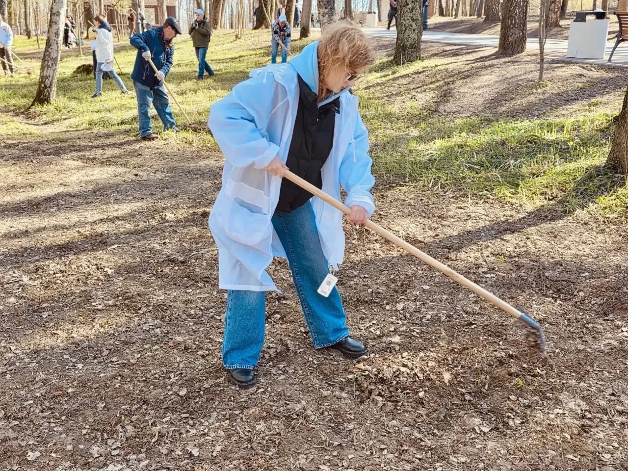 Во время субботника убрали мусор и сухостой, обрезали поврежденные ветки. Всего собрано и упаковано несколько сотен килограммов отходов.