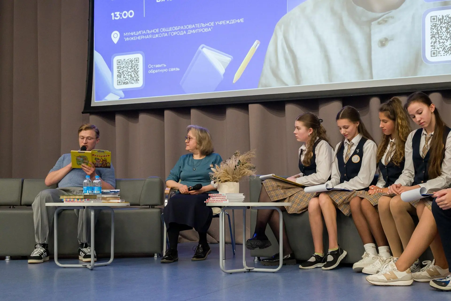 Он рассказал ребятам о своём пути в профессию, учёбе и съёмках. А потом провёл мастер-класс по выразительному чтению: самые смелые школьники читали отрывки из рассказов Носова «Мишкина каша» и «Фантазёры» и получали советы прямо от мастера.