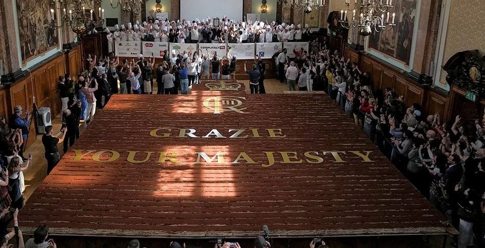 На рекордный тирамису ушло около 50 тысяч печений савоярди и больше 3000 яиц. Готовили два дня, а судьи Гиннесса лично подтвердили достижение. Десерт посвятили британской королевской семье и украсили золотой короной.