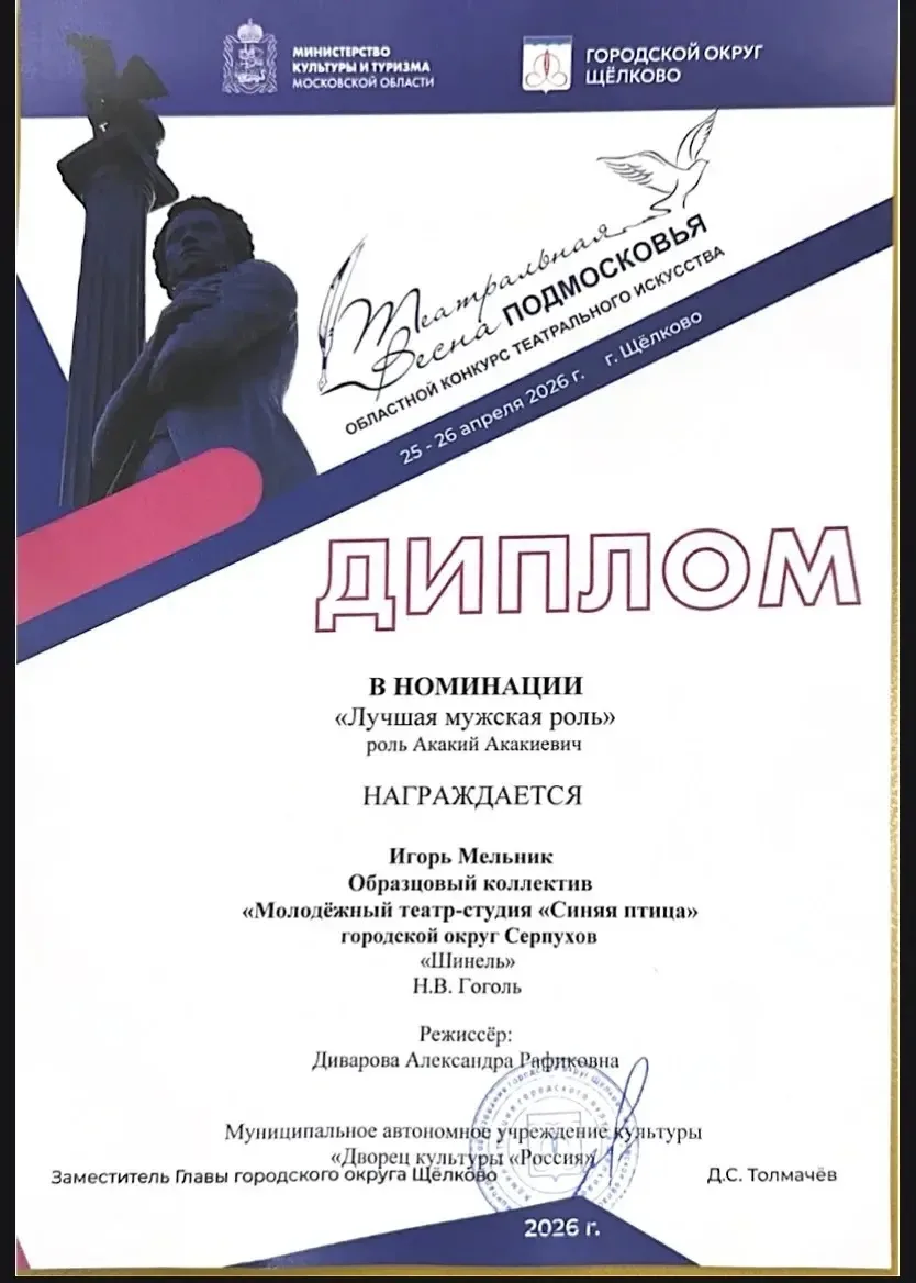 Диплом за лучшую мужскую роль получил Игорь Мельник за проникновенное исполнение роли Акакия Акакиевича — его игра стала настоящим откровением для публики.