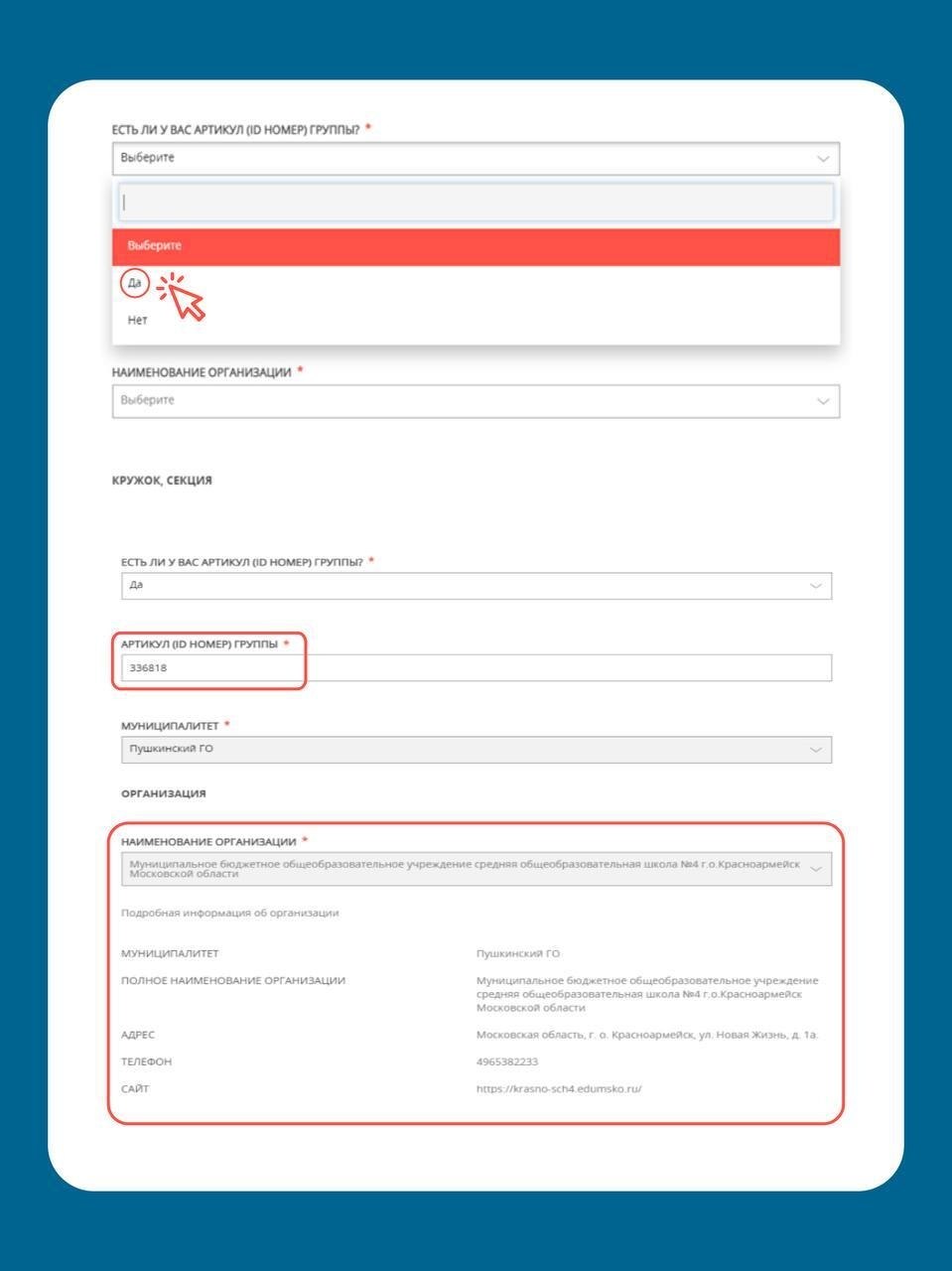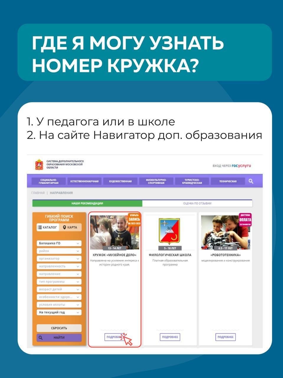 Выбрать кружок и узнать его ID можно в «Навигаторе дополнительного образования»: new.dop.mosreg.ru