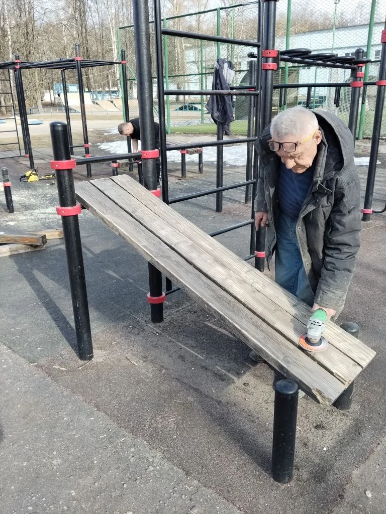 Площадка для воркаута — установлены турники, брусья, скамьи для пресса и другие снаряды. Оборудование проверено и укреплено.