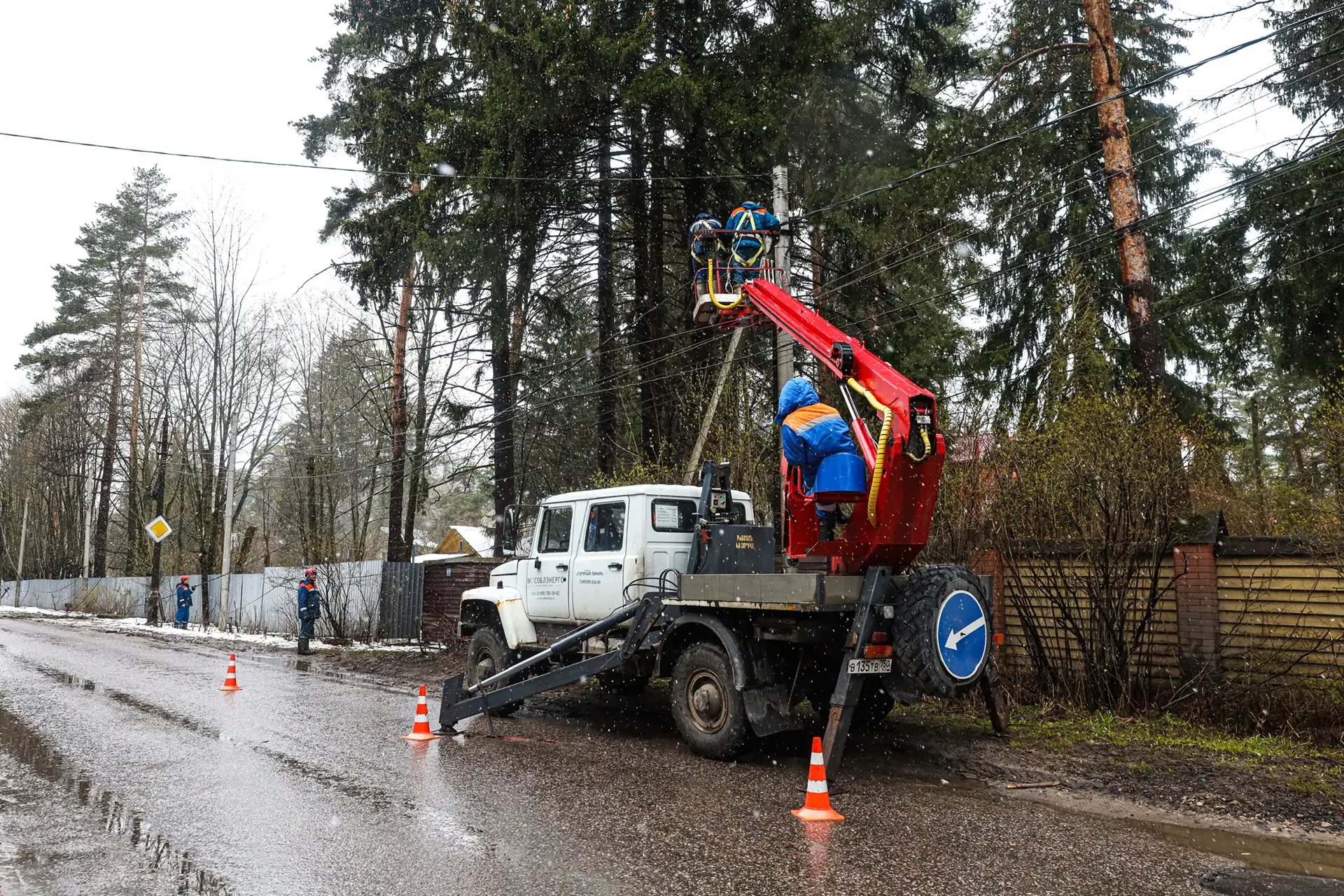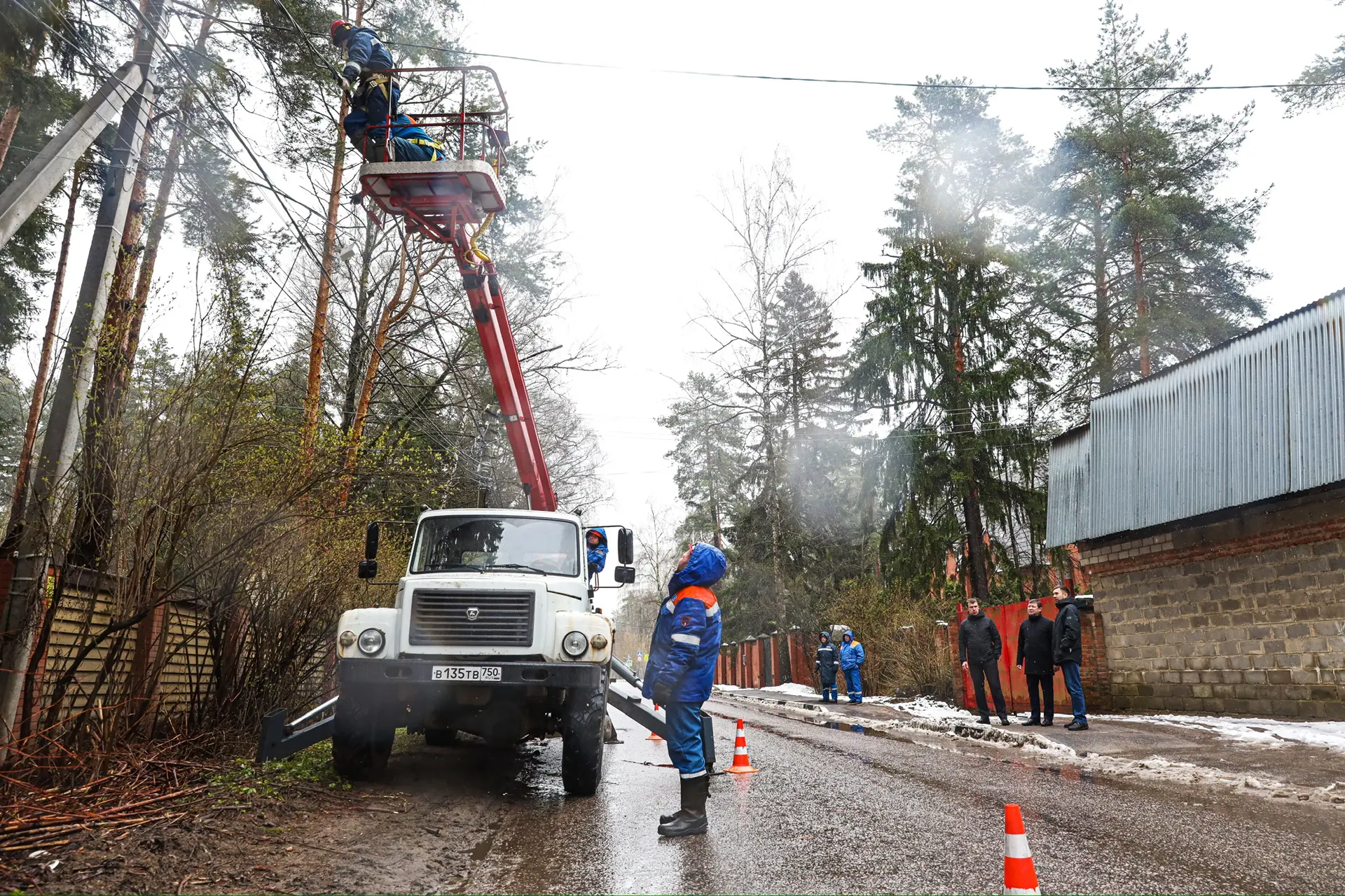 Нахожусь на месте проведения аварийновосстановительных работ, где сейчас трудятся бригады «Мособлэнерго» (всего задействовано 10 бригад) и «Россетей» (15 бригад).