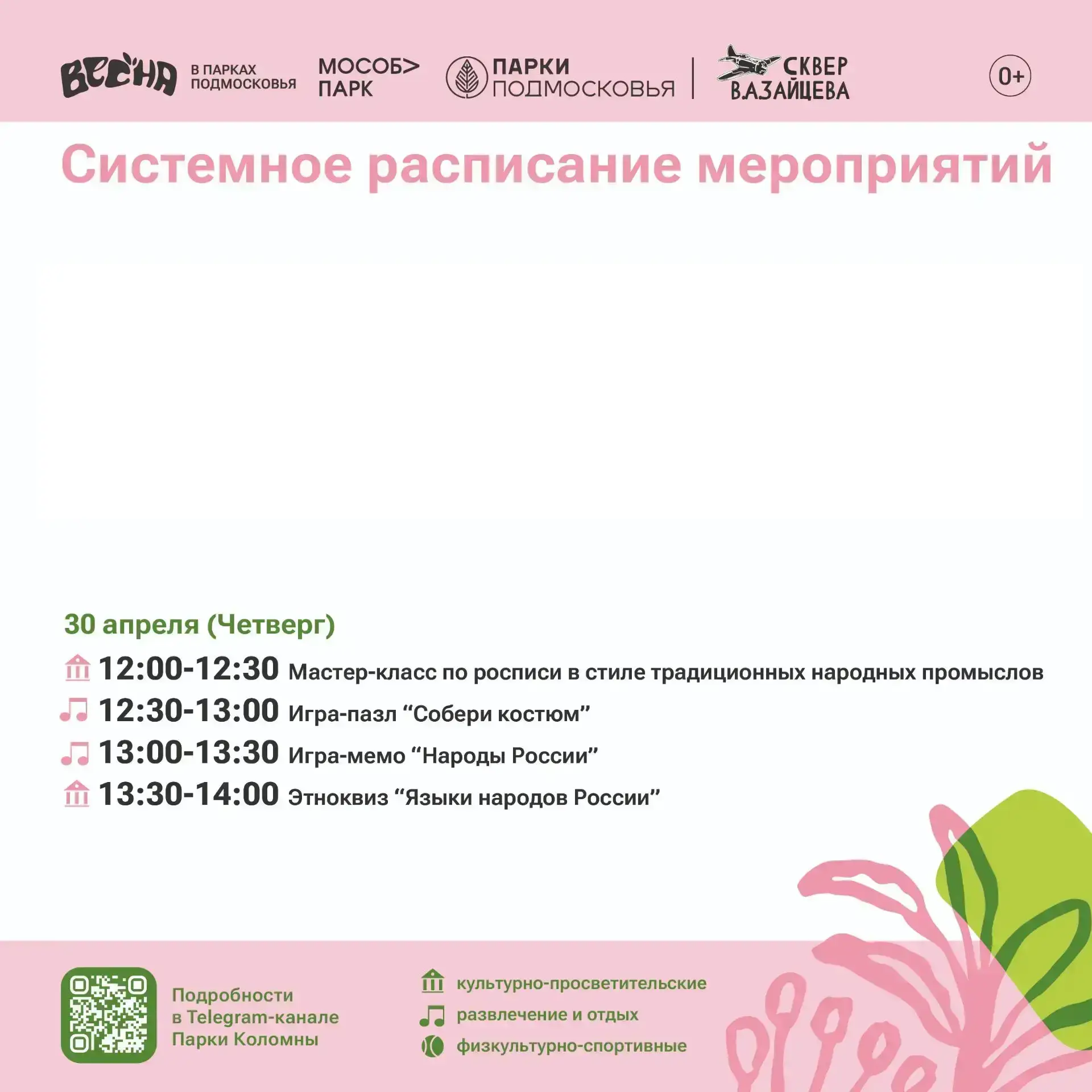 Парки Городского округа Коломна приглашают маленьких и взрослых провести время на свежем воздухе - активно, весело и с пользой. На этой неделе в парках снова запланировано множество мероприятий, в том числе, новинки – мастер-классы, игры и интерактивы, посвященные традициям народов России.