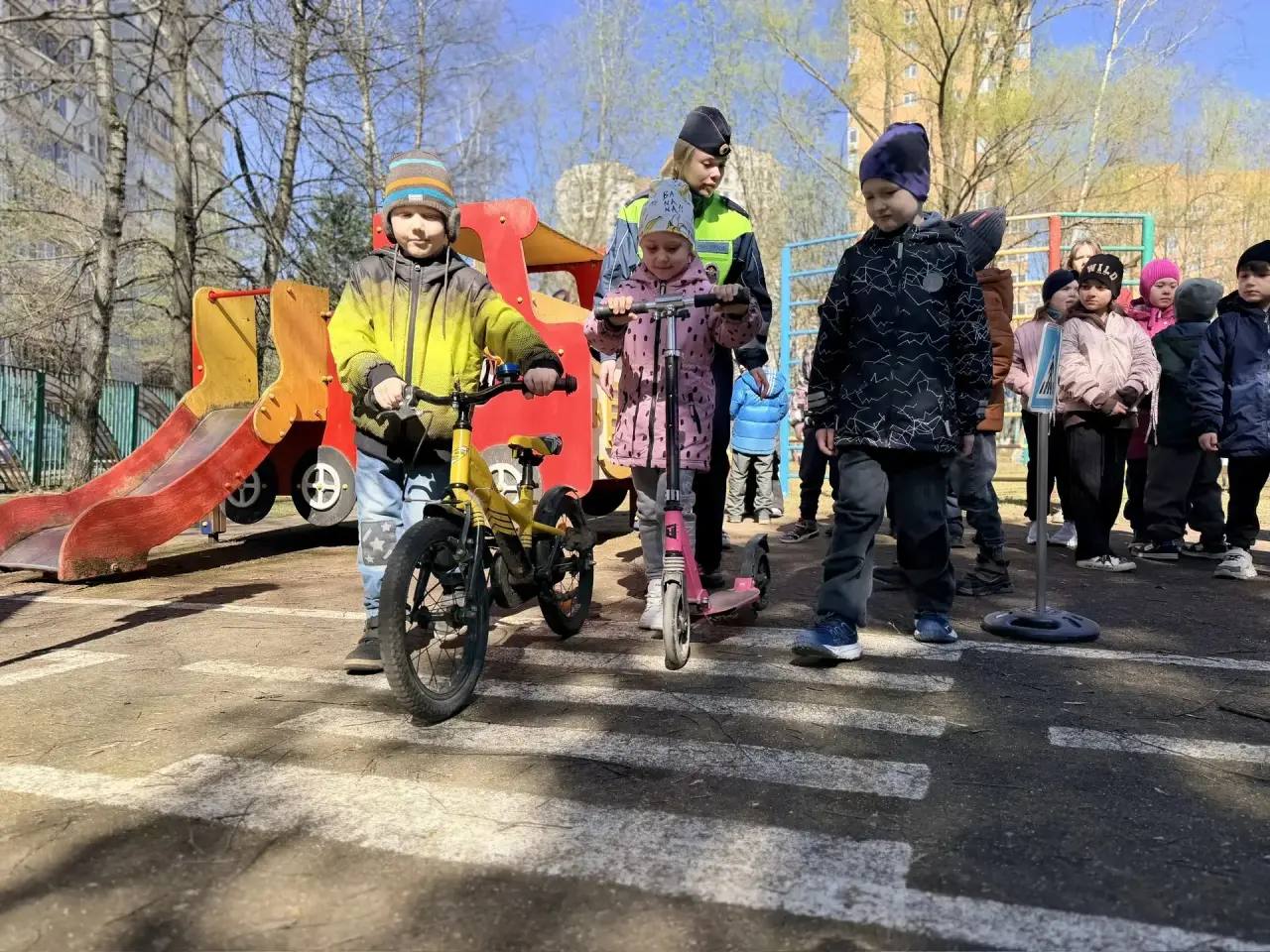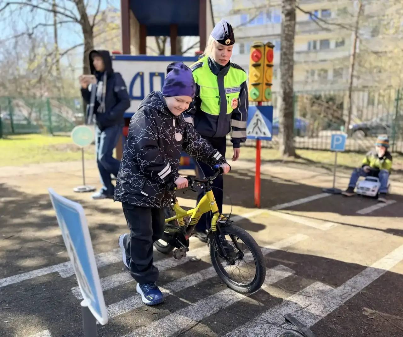 В рамках занятия на транспортной площадке ребята узнали, как правильно переходить дорогу, если ты на велосипеде или самокате, закрепили сигналы светофора на практике и попробовали себя в роли и пешеходов, и водителей.