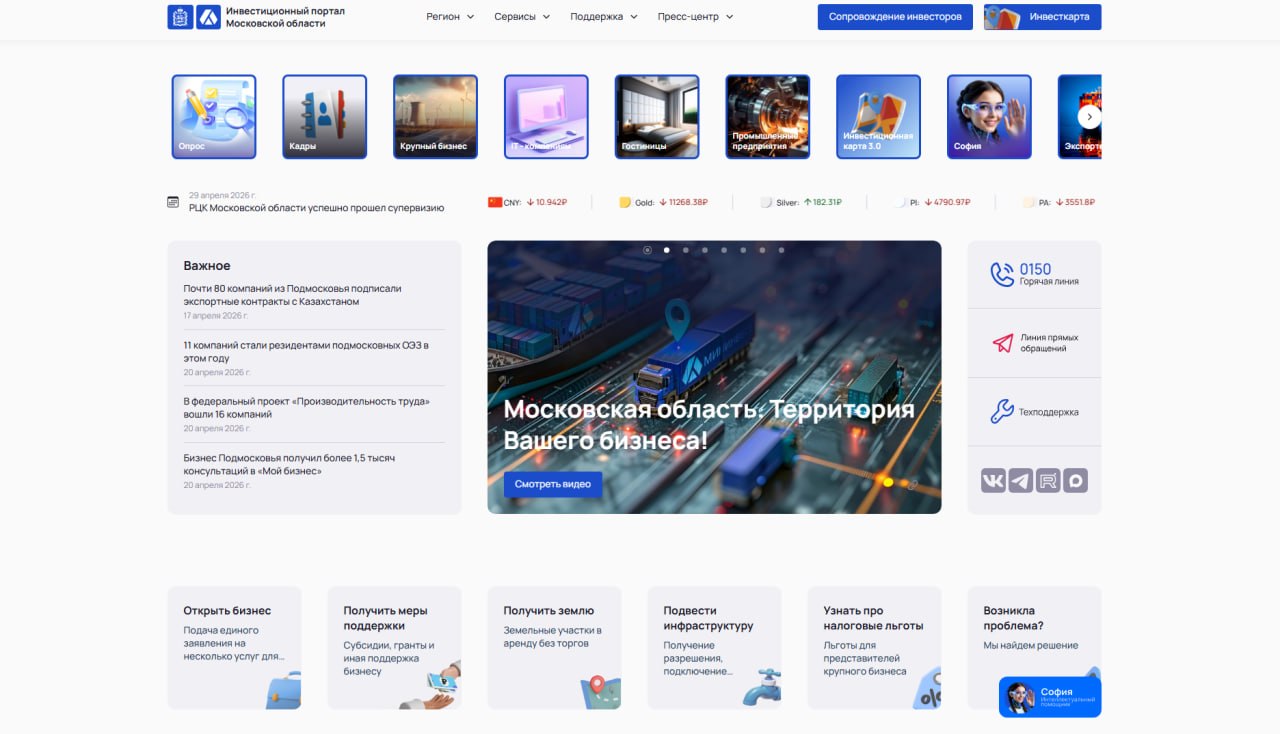 Инвестпортал Московской области объединяет ключевые сервисы для предпринимателей и инвесторов. Всё, что нужно для старта или развития проекта, собрано на одной платформе.