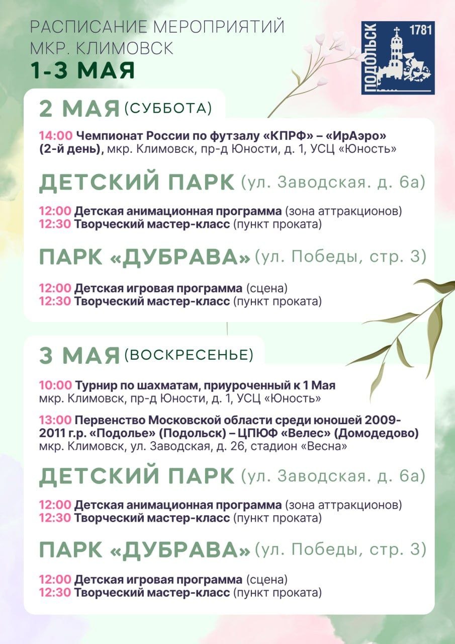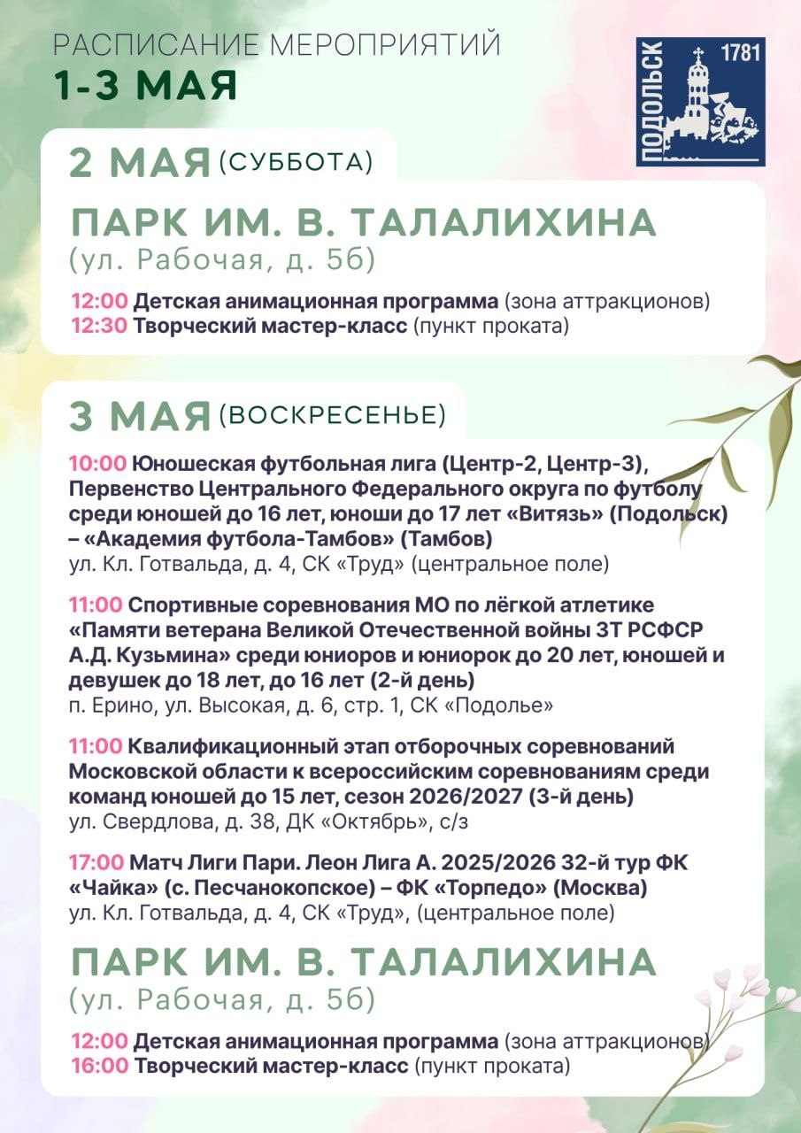 В парке имени Виктора Талалихина гостей ждёт насыщенная программа: выставка ретроавтомобилей, иммерсивный фестиваль «Подольск. Не проездом», тематические площадки музеев и библиотек, историческая экскурсия «Наш старый парк» в 15:00. На главной сцене развернётся настоящее путешествие во времени — театральные миниатюры, бал, цирковые номера и многое другое.