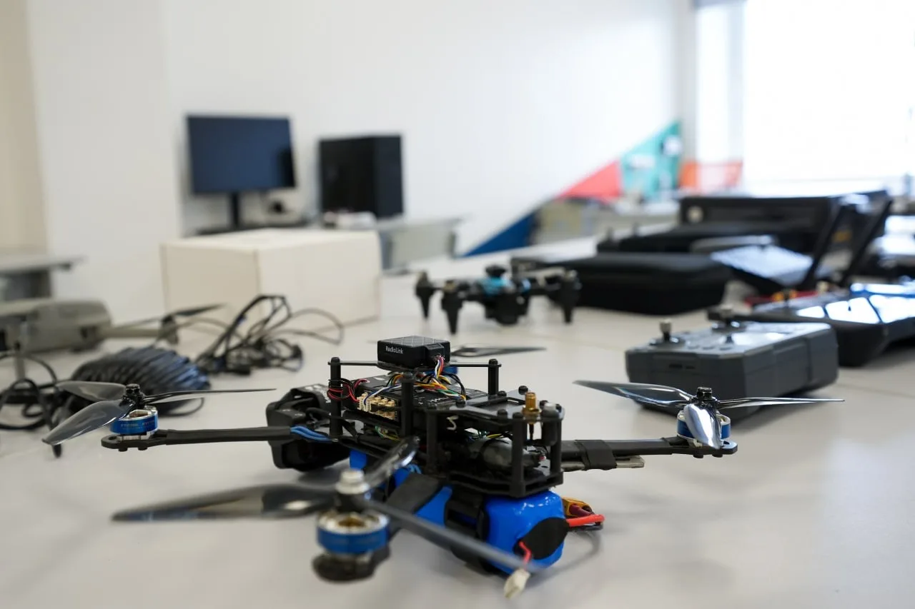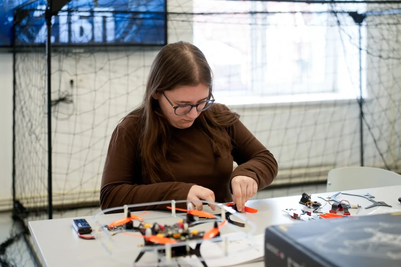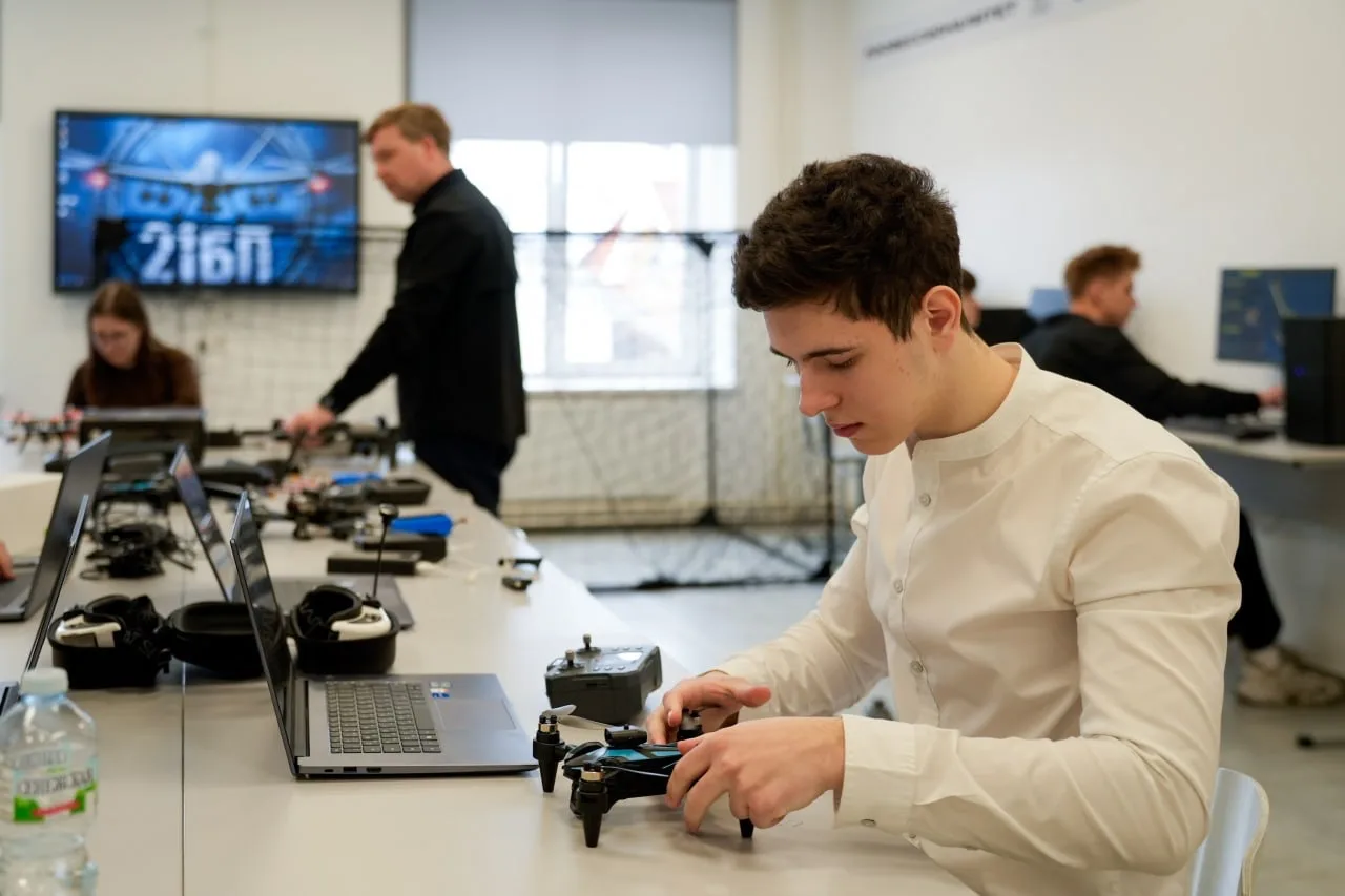 Особая гордость — лаборатория БПЛА. Студенты проходят предполетную диагностику, тренируются на симуляторах, летают на реальных дронах — от учебных квадрокоптеров до профессиональных систем для мониторинга и спасательных операций. Практику ребята проходят под руководством пилотов международного класса и участников СВО.