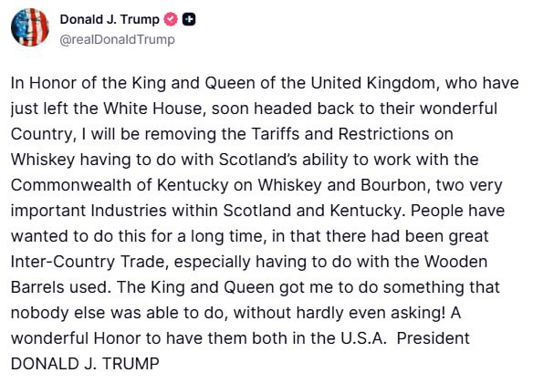 Трамп отменит пошлины на шотландский виски. Он написал в соцсети Truth, что сделает это в честь короля и королевы Британии, которые сегодня заканчивают визит в США.