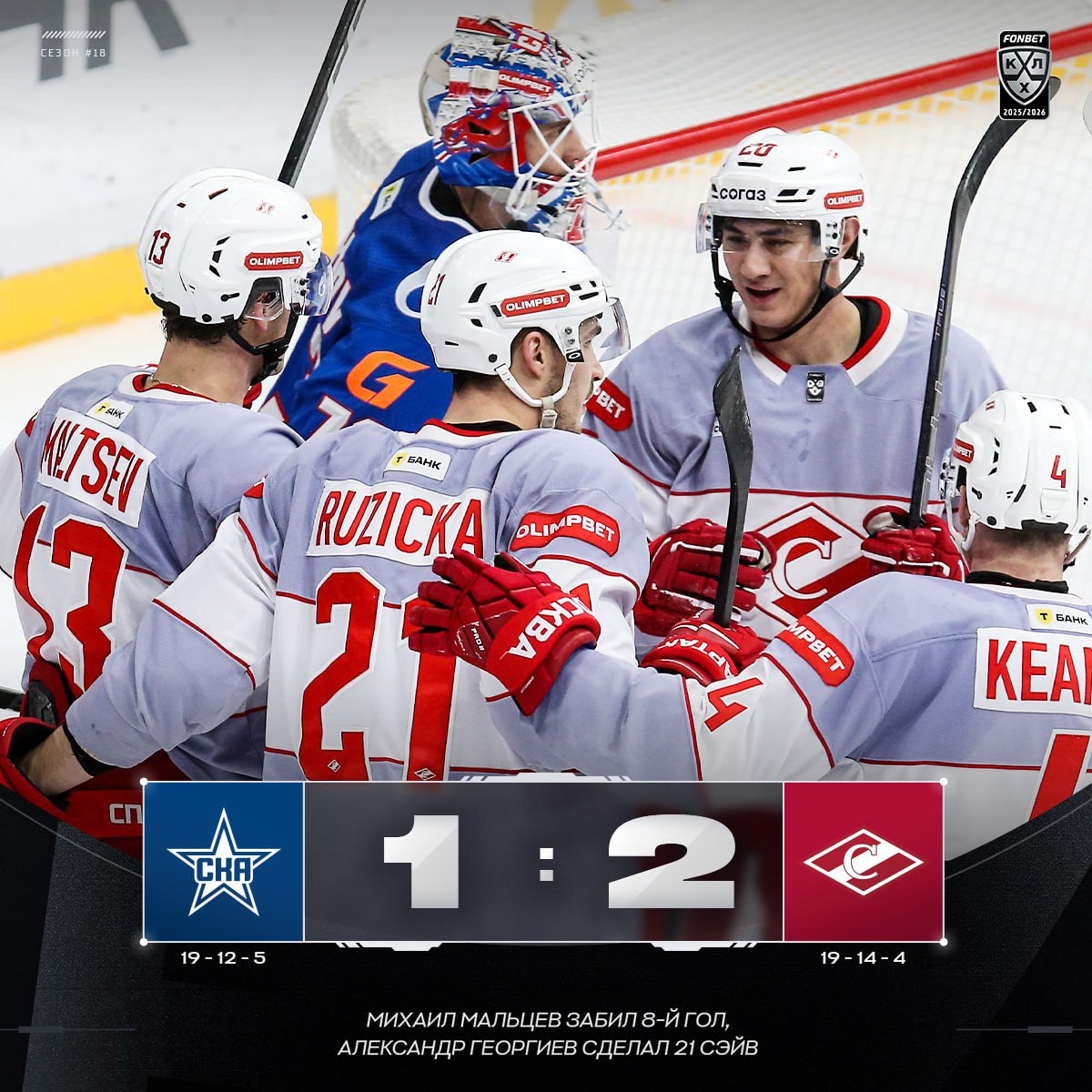 Московский «Спартак» обыграл петербургский СКА со счетом 2:1 в гостевом матче регулярного чемпионата «Фонбет» — КХЛ.